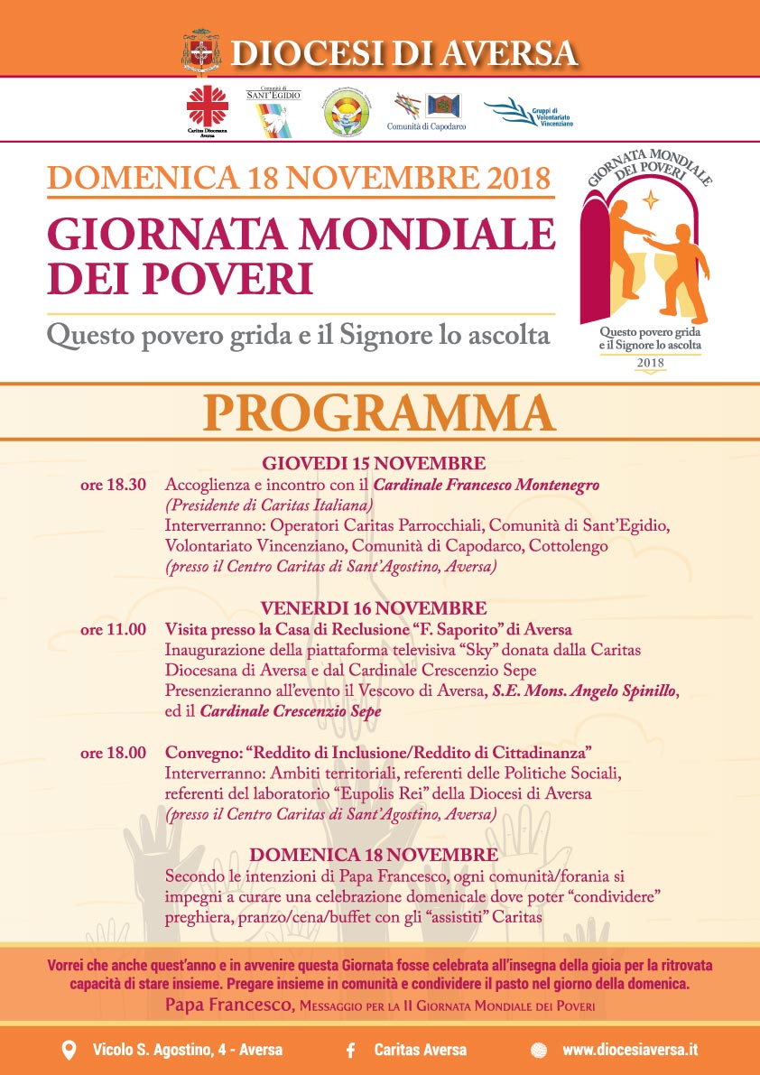 Domenica 18 novembre 2018 si celebrerà la seconda Giornata mondiale dei Poveri, istituita da Papa Francesco al termine del Giubileo della Misericordia nel 2016, nella lettera apostolica “Misericordia et misera”. In vista di questo appuntamento, anche la diocesi di Aversa si è attivata in collaborazione con la Caritas per compilare un fitto programma di iniziative.