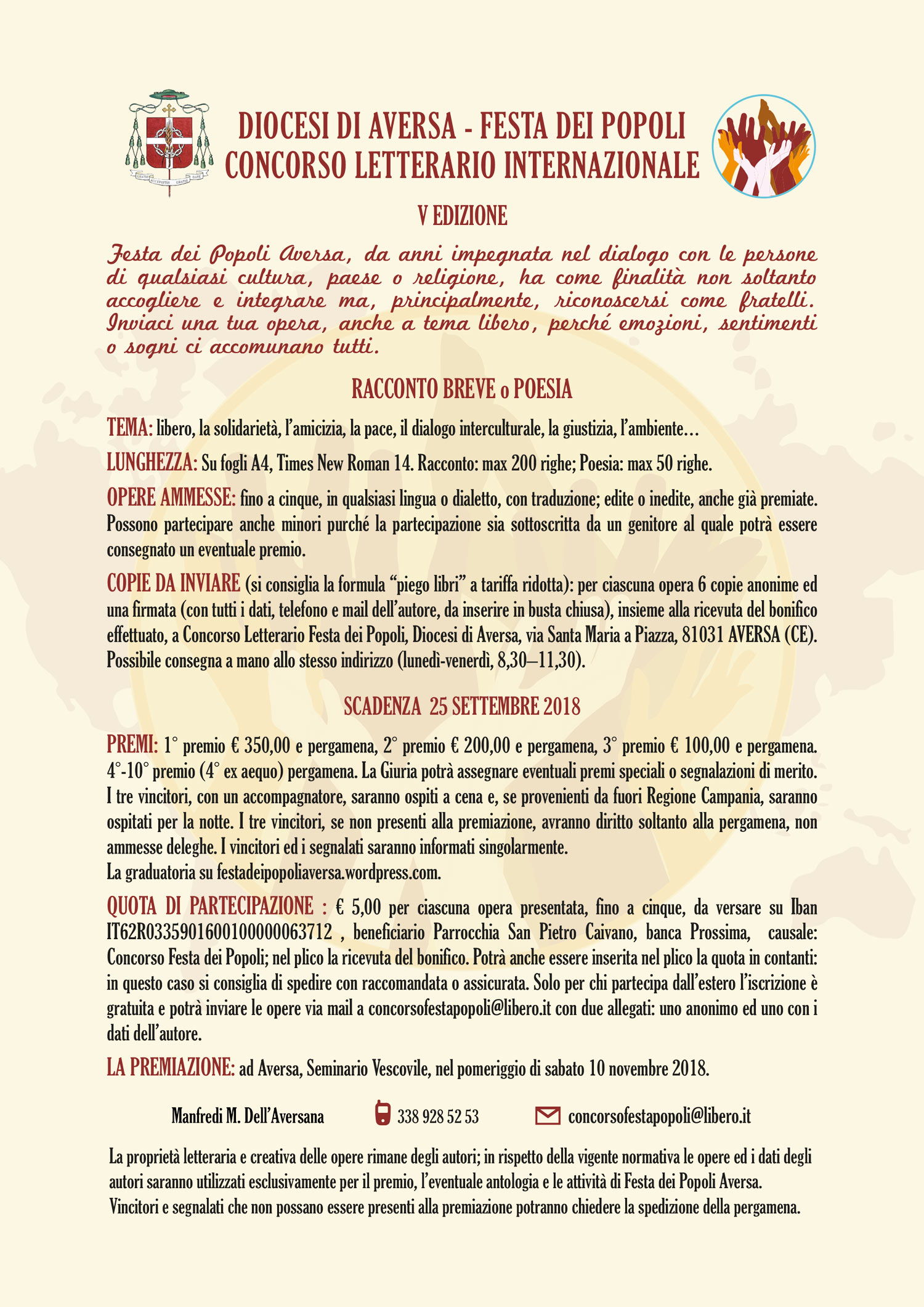 Pubblicato il bando del V Concorso Letterario Internazionale “Festa dei Popoli”, organizzato dalla Diocesi di Aversa