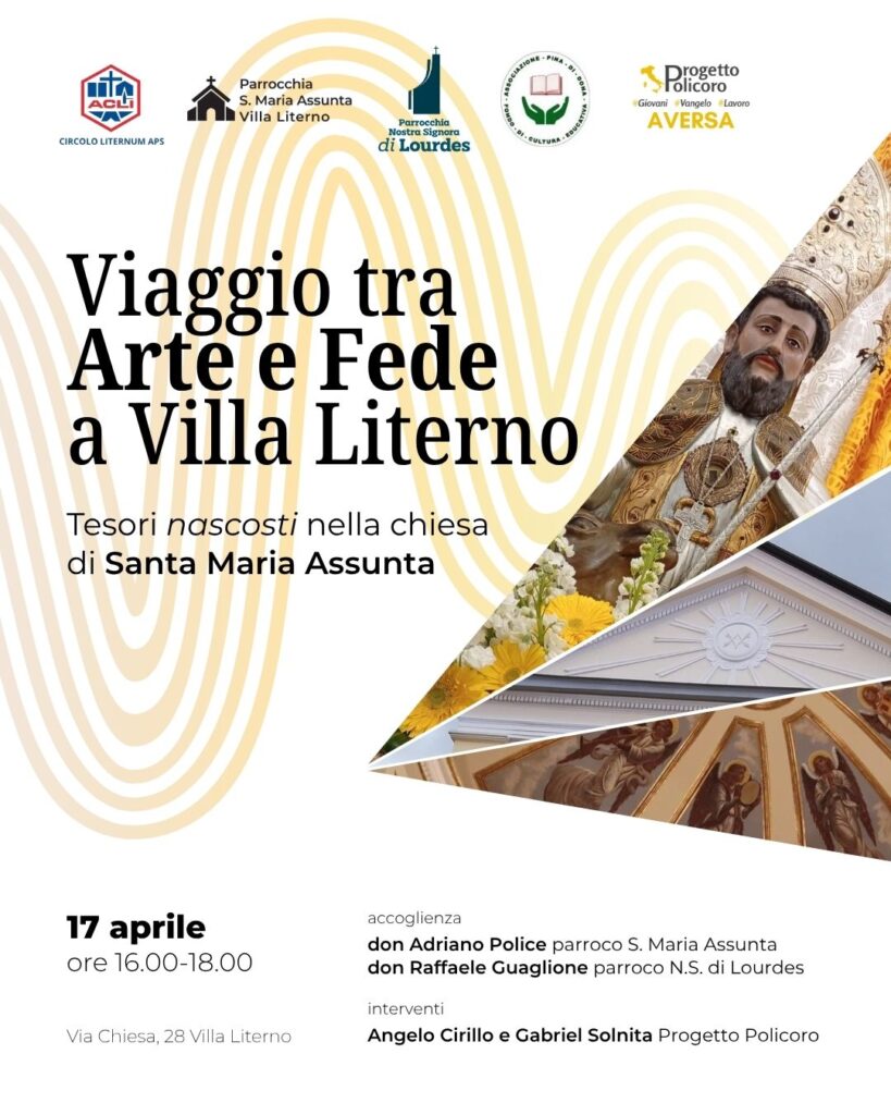 Venerdì 17 aprile le parrocchie Santa Maria Assunta e Madonna di Lourdes di Villa Literno promuovono un incontro dal titolo “Viaggio tra Arte e Fede a Villa Literno. Tesori nascosti nella chiesa di Santa Maria Assunta”, dedicato ai bambini del catechismo con l’obiettivo di avvicinarli, in modo coinvolgente e interattivo, alla storia, al patrimonio artistico e al significato liturgico degli spazi della chiesa.